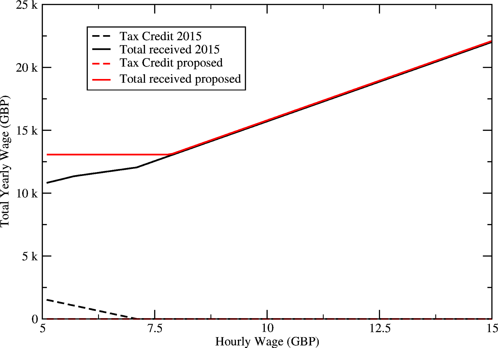 These graphs do not take into consideration the increase in minimum wage as they are a sum of yearly income. The rules described above can be rewritten in terms of weekly earnings as described in revenue benefits. The increase in minimum wage is expressed as all those earning below £7.85 now earning exactly that much. This is again a limiting case as the chances are that those earning slightly more than £7.85 now will have their wage increased to highlight the fact they were earning more than minimum wage before. The yearly wage is calculated assuming a 40 hour working week and 28 days of holiday including bank holidays.